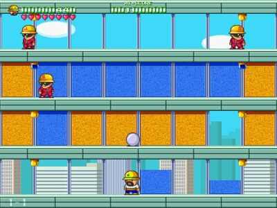 | 敵にとられないようにしながら自分の色で壁を塗っていくゲーム。 キャラが出来る行動は4つ。 ジャンプで敵を踏む 飛び道具で敵を攻撃する。 下から頭突きで敵を攻撃する。 あとは壁を塗る。です。 (もちろん移動とジャンプはできますが。) ステージのクリア条件は半分以上自分(達)の色で埋めること。 ボスがでてくるステージではボスも倒さなければなりません。 あとアイテムがあってキャラを助けてくれますが ステージが進むと床が動いたり滑ったりでもう大変。 敵もすごく多くなってだんだん難しくなります。 ルールを覚えるのは簡単なので一度やってみては? 2人協力モードもありますのでわいわいやれますよ。 |