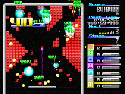 | 7種類の特殊技を使って、ブロックを破壊していくブロック崩し。 特殊技は パワーボール 分裂弾(3つ) ロングバー リモコンボール(ボールとバーとがひもでつながれ、常にボールがバーの真上のどこかにいる状態) 分裂弾(7つ) レーザー(バーからミサイルを発射する) など、が用意されている。 その特殊技を併用することによって、一気に大量のブロックを破壊することが可能だ。 また、連続でブロックを壊すと、コンボ技みたいになって、点数が一気に増えて一機アップしたり、 技の使用時間が増えたりするのも、おもしろさを引き出している。 ステージは、エディタを使用すれば自分で作ることができるし、 作者のホームページには、追加ステージも用意されている。 |