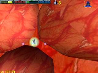 赤の武器は攻撃力重視で、最大強化時には敵に命中後小爆発を引き起こすナパーム弾を発射します。