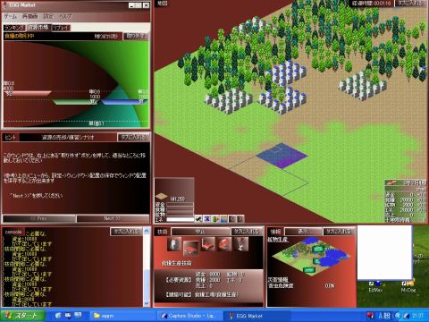 | 資金,食料,鉱物,エネルギーを蓄え、他の誰よりも早く「世界の中心」を建造することが目的のネットワーク対戦型シミュレーションゲーム。 1ゲーム6人〜10人までの参加が可能です。 基本的な手順は土地を確保し、技術を開発して、お金と鉱物を使用して建物をたてて、上の4つの資源を集めていきます。 このゲームには市場での資源の取引があります。 ネット上の敵と市場で値段の駆け引きをして、必要な資源を手に入れ 相手を出し抜いて誰よりも早く「世界の中心」を作りましょう。 |