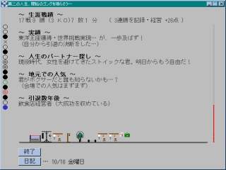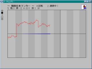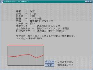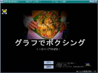 ボクシング選手のデビューから引退までの人生を追体験できるゲーム。 試合は完全に一本のグラフで再現されていて一見地味ですが、 ボクシングの全てがその一本のグラフに集約されていると言っても過言ではないでしょう。 無惨に負けてしまうときもあれば、奇跡の逆転KO勝ちというときもある。 一本のグラフで繰り広げられる完全オート形式の試合。 完全に運任せの試合結果にどきどきしてしまうこと請け合いです。 1プレイ20分前後の短めのゲームですが、もう一度プレイしたくなるほどの中毒性を持っています。 始めに言っておきます。 小難しいことを考える必要は一切ありません。 基本的にダイアログ形式でストーリーやイベントが進んでいくので 適当にクリックしていけばゲームは進行していきます。 ただし、選択技を誤ると取り返しのつかないことになる…かもしれません。 ちなみに完全にランダムなストーリー展開なので全く予測がつきません。 試合は基本的に完全オートなので見ているだけで試合が進んでいきます。 グラフが一番上に行けばKO勝ち、一番下に行けばKO負けになります。 どちらにも行かないままグラフが右端に行けば判定に持ち込まれ、 中央の直線よりグラフが上に行った時間、下に行った時間がどれだけ多いかで勝負が決まります。 しかしグラフが急上昇したりいきなり急降下したりで息もつかせぬ試合展開になることは言うまでもありません。 時折チンピラ退治や地獄のキャンプ、鬼コーチの猛特訓等のミニゲームがありますが、 基本的にマウスのみの操作で、 ルールも単純かつゲーム内で解説してくれるので特にここに書く必要はないでしょう。 なお、ゲームは基本的に引退するまで続きます。 その間、世界チャンピオンの連続防衛を目指したり、 ひたすら連勝を重ね続けるなど色々な楽しみ方が堪能できるでしょう。 (Reviewer RYO) |