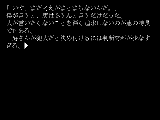 | 高校を卒業したばかりの真田誠と天野恵は卒業旅行に出かける。 雨宿りで立ち寄った館での殺人サスペンス ストーリーは話すと面白みがなくなるのでここではこのくらいにしておきます。 ほとんど画像がないぶんたまにでてくる画像が印象的です。 平均プレイ時間は30分ほどです。 起動には「TNsystem」というソフトが必要ですので、ここで検索してゲットしてください。 |