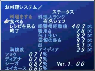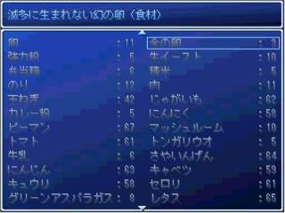 このゲームは「Holy Knights〜忘れられた手紙〜 」というゲームの番外編にあたります。 ですが、初めての方にも難なくプレイできるような設定です。 実際、私は元のゲームをやっていなくても、十分に1つのゲームとして楽しめました。 さて、主人公は村のお金持ちのお坊ちゃん「アミク・フェアティ」 クリスマス間近のある日の夜、アミクは近所のおじさんが殺されて自分もピエロに刺し殺されるという不吉な夢を見る。 次の日の夜、自分は殺されはしなかったものの、夢通りにおじさんが殺されてしまう。 アミクは事件の真相を探りに友人の「シーガ」、「エイカース」と共に冒険をする。 このゲームの最大の特徴は、「お料理システム」というものです。 主人公達はマップを歩くたびに満腹度が下がっていきます。低くなってしまうと力が出なくなったりしています。 満腹度を上げるためには食材を集めてアミクが料理した物を食べる、と言ういうわけです。 料理はただ満腹度を上げるだけでなく、回復やステータス上昇など、さまざまな効果があります。 このゲームはLvUpによるステータスの上昇が期待できないので、料理に頼ることになります。 また、料理にはLvがあり、Lvが高くなると効果も大きいです。 食材は、モンスターを倒したり、フィールド上から拾ったりします。 また、店から購入することなども出来ます。 料理を作るアミク自身にも調理の技術ステータスがあります。これが高くないと折角の料理も不味いままです。 これは、料理を作ることによって上昇するので何度も作りましょう。 他にも、仲間と会話できる「会話システム」があり、ただの世間話や、これからの重要なヒントがあったりします。 たまに出てくる選択肢によってエンディングが変化する「マルチエンディングシステム」というものもあるそうです。 クリア後には作者のあとがき等も聞けちゃう街が存在するそうです。 このように、プレイヤーを飽きさせないシステムが多数存在します。 (Reviewer 流星) |