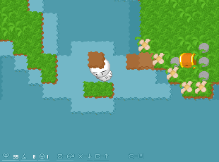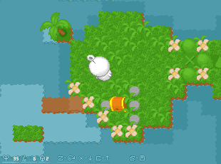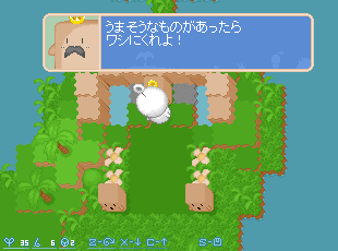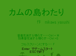 | ワンパクボウヤのカムカムくんのお陰でCon博士のケンキュウジョは荒れ放題 怒った博士はお仕置きを考えました。 カムカムくんは、とうとう、みたこともない島においてけぼり。 どうやって帰るのでしょう? このゲームは基本的にはブロックを使って足場を作って島を渡って行くことを繰り返します。 ブロックは自分の足下にしかおけないのでロープを使って本来は入れない水の中へ進入することになります。 ロープの数が増えると遠く方まで足場を作ることが出来るようになり、新たな島への道ができます。 また段差の概念があります。 主人公は1段差までしか登ることができませんので、ブロックを駆使していろんなところへ行って下さい。 島をわたっていくとパズルステージがあります。 はっきり言って難しく、本当にロープはこれで足りるのかとか思いますが、 そのステージにたどり着けたと言うことはクリアできるだけのロープを持っていることを意味しますので 諦めず頑張って考えて下さい。 草の上でならSボタンを押すだけでセーブが出来るのでこまめにやるといいでしょう。 (たまにエラーで十字キー以外のキーを受け付けなくなるときがありますので…) 説明書には詳しい操作方法(ゲームルール)が載っていないので 自分でやり方を見つけるというのもこのゲームの楽しさだと思います。 下手な説明でごめんなさい。 容量は350KBくらいでとても軽いので まずはやってみてください。 |