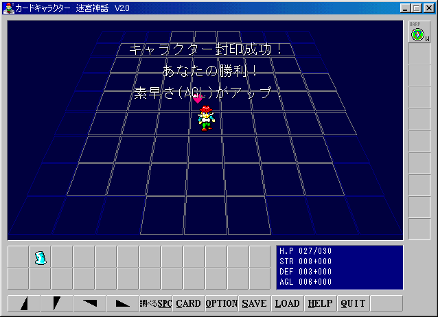 | ダンジョンを探索して敵を倒し、敵をカードに封印するゲーム。 独特の戦闘シーンです。 ダンジョンは入るたびに変わるランダムなダンジョンです。 3つのダンジョンがあり、それぞれ地下10回まであります。 もぐるごとに、また新しいダンジョンに進むごとに敵が強くなっていきます。 敵を倒し、カードに封印するとカードを使用することができます。 カードを使用すると封印した敵の能力に応じて技を使うことができます。 カードはなくなりませんが、パワーを失い、宿屋で泊まるまで再び使うことはできません。 すべての種類のカードを集めるとゲームクリアです。 |