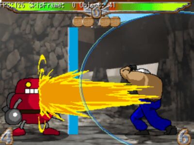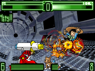 銃を使うという、変わった感じの格闘ゲーム。 でもシステムはしっかりしていて正統派のゲームです。 2人プレイも可能。 画面下部に出ている数字は銃弾の残りで、 ボタンを押すことによって入れ直すことも可能。 敵を銃で撃ちまくると爽快です。 |