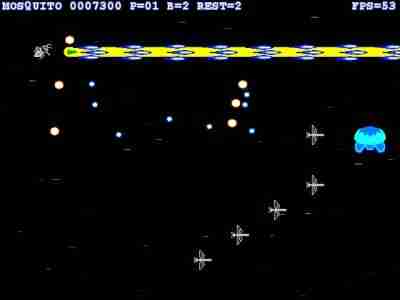 | なんと蚊が主人公の横スクロールシューティングゲーム エネルギーをストックしてレーザーやボムを打つことが出きる。 3タイプのキャラを選択することができ、スピードや特技に違いがある。 難易度は結構高く、早めにレーザーや、ボムを使って敵に対処しないと 敵と球が沢山攻めてきて、辛い状況に追いやられます。 サイズが軽いので気軽に出来ると思います。 |