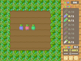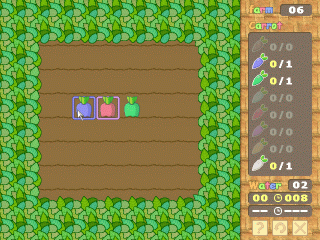 | 光の3原則を利用して畑のニンジンの色を変えて目的の色を収穫するゲーム。 水を与えるとその周りのニンジンの色が光の3原則に従って変化します。 カーソルを合わせると周りが何色になるか囲まれる四角形の色で分かります。 ステージごとに決められた色と数を収穫するとステージクリアです。 全50の難解なステージがあなたを待ちかまえています。 |