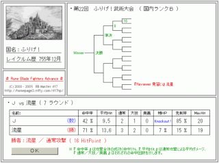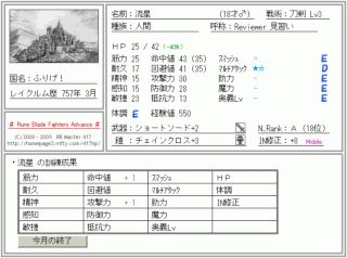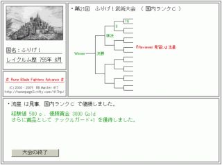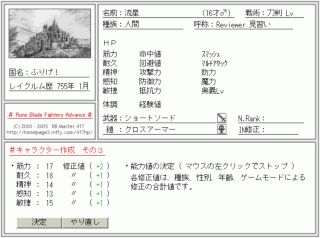 ふりげ!でも既に紹介されている「Rune Blade Fighters 2000」の進化版です。 前作と比べて、新たに「精神」「奥義Lv」「魔術」など多数追加されています。 仮想世界『 レイクルム大陸 』の住人となり、最強の戦士になることを目指します。 5年間という限られた育成期間の中で修行や大会を繰り返し、キャラを成長させていきます。 育成期間を終えたキャラは「闘技場モード」で強者達と戦うことも出来ますし、 新しいキャラの師匠と成って、師匠が優秀な戦士であったなら弟子にボーナスがあります。 また、公式HPにて、他のプレイヤーが育てたキャラクターと レイクルム最強を争う『レイクルムランキング戦』で戦わせることも出来ます。 テキストベースのゲームですが、細かい所は各プレイヤーの豊かな想像力によるカバーを期待しています。 このゲームは、限られた期間でどれだけ能力を上げられるか、プレイヤーの力量が問われます。 キャラクター作成時に初期能力値と特殊ボーナスを決めますが、ランダムに変化するのをマウスクリックで止めるので 納得するまで何度も挑戦してください。 まずは半年に一度の剣術大会で優勝することを目指して育成をします。 月ごとに「経験値」が貰えるので、それを訓練に割り振って能力を上げます。 戦闘はオートで行われるので、キャラの勝利を祈りましょう。 剣術大会で準決勝まで進むと、ランクを上げることが出来ます。 ランクが上がると経験値が多く貰えるので、訓練に多くの割り振りが出来ます。 また、優勝すると副賞として武具が貰えるので、装備したり売ったりすることができます。 さらに、「選択技術」でキャラに特徴を付けることが出来ます。 選択技術を身につけるには、条件と経験値が必要ですが、キャラが、より強くなります。 ただし、選択技術は5つまでしか付けられないので厳選して付けましょう。 経験値やお金が足りないときには、「冒険者ギルド」で仕事を成功させることにより 経験値とお金を入手できます。(失敗すると経験値が少量のみ) 初期能力値や剣術大会のトーナメント表、戦闘、仕事の成功・失敗などには運の要素が大きいので 何度も挑戦することにより、いい結果が出せるかもしれません。 あなたがこだわればこだわるほど、キャラはより強くなっていきます。 レイクルムランキング戦であなたの育てたキャラが活躍するときは、完全に虜になっていることでしょう。 普通のRPGじゃ物足りない!という方にお勧めです。 (Reviewer 流星) |