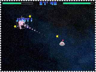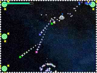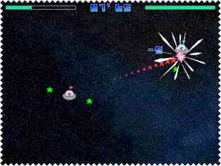 | 自機の周りを回っている星からレーザーを発射! 敵をレーザーで吹っ飛ばして破壊しよう。 さまざまなモードが用意されています。 基本的なルールは自機の周りを回る照準からレーザーを発射し 敵にあてて、敵を吹き飛ばし、壁にあててダメージをあたえるというルールです。 レーザーがあたるだけでもダメージは少しありますが、壁に当てなければ敵を倒すことはできないでしょう。 敵との対戦はコンピュータとの1対1と2人で戦うモードの2種類があります。 レーザーの威力や特殊能力などステージごとに違っていることも面白いです。 いかに短時間でクリアできるか?がこのゲームの面白さです。 ターゲット破壊モードは弱いターゲット強いターゲット攻撃してくるターゲット などをすべて破壊すればクリアとなります。 こちらもどれだけ短い時間でクリアできるかが重要です。 一人で次々と現れる泡のようなものを破壊するモードも用意されています。 特殊ルールに敵からの攻撃を跳ね返すJUST!というルールがあります。 タイミングよく敵からのレーザーと反対方向にキーを入力するとそっくりそのまま跳ね返すことができます。 また、壁にぶつかる時にも同じことが可能です。 このゲームにははじめからリプレイデータが入っていて、それらのプレイには驚かされます。 気軽にプレイできるゲームですので、どうぞお試しください。 (Reviewer chao) |